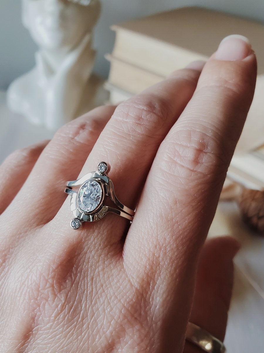 A testament to patience, resilience, and divine order, the Saturn Ring Set in solid 14k gold honors both the majesty of the planet Saturn and the wisdom of the god of time and harvest. This interlocking dual-band design features a 7x5mm oval gemstone of your choice, embraced by two sculpted arches, each crowned with a luminous accent stone. Rendered in gold, the form gains weight and gravity — a reflection of endurance.