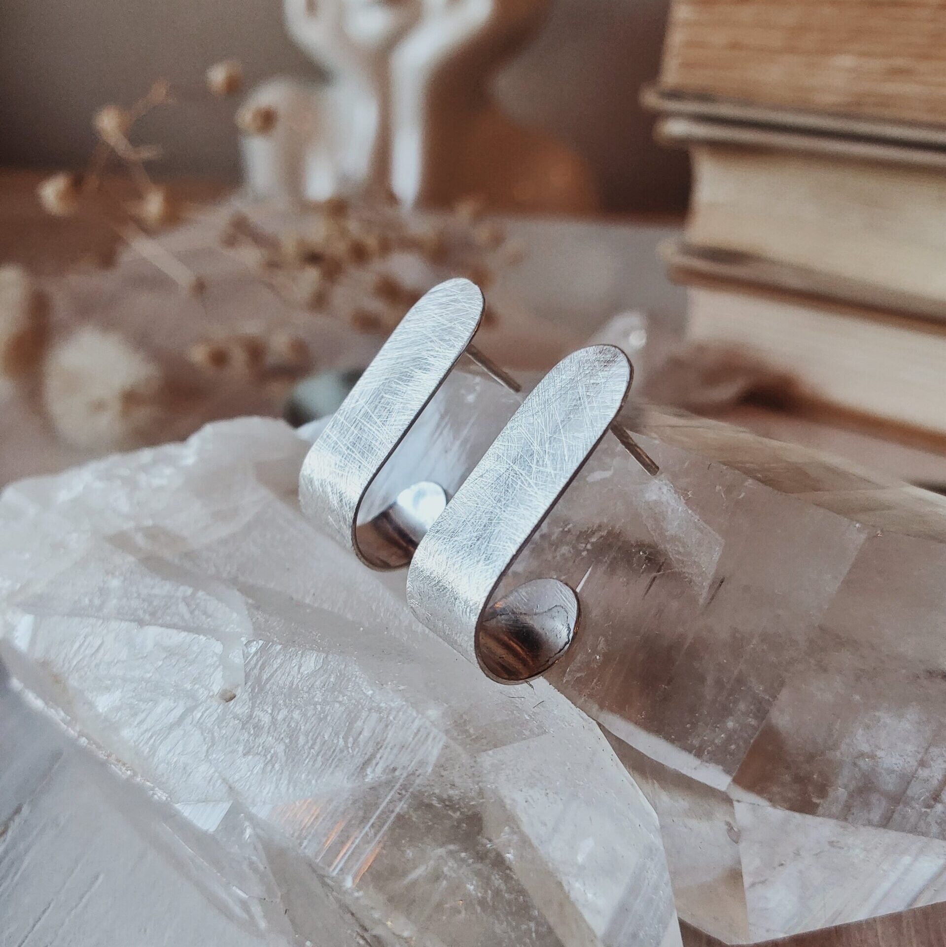 Sculpted as fluid symbols of vision and passage, these elegant arch hoop earrings are inspired by the meaning of Rya—flowing water, dream, and vision—and they shimmer with gentle curves and modern grace. Each pair is formed by hand, shaped into a textured oval before one end turns upward into a flat-faced hoop, creating a design that feels both architectural and organic. Their soft shimmer is reminiscent of water catching the light, symbolizing clarity and the hope of walking between thresholds. The Rya earrings embody transformation and the timeless elegance of dreams in motion.