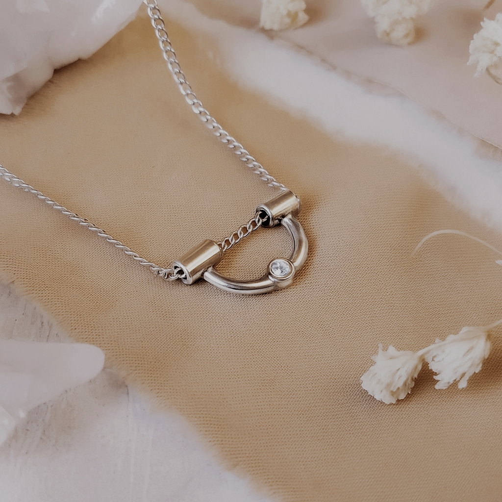 The Umbra Tiny Arch Necklace is a quiet study in balance — light meeting shadow, form meeting meaning. Handcrafted in sterling silver, this pretty little necklace features a sculptural curved pendant with a single moissanite accent that catches the light like a hidden star. Its minimalist design reflects the celestial term umbra — the darkest part of a shadow — reminding us that beauty often reveals itself in contrast.